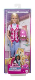 Barbie ‘Malibu’ doll is ready for horseback riding adventures! With a stylish riding outfit, she looks just like her character from the Netflix series, Barbie Mysteries: The Great Horse Chase. The fashion doll wears a removable shirt and vest, pants, boots, and helmet — and bends at the elbows, wrists, and knees for realistic riding play! Doll cannot stand alone. Colors and decorations may vary.