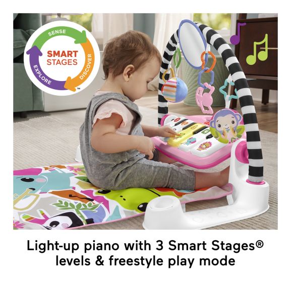 Get your little one moving, grooving (and learning) with the Glow and Grow Kick & Play Piano Gym from Fisher-Price. This soft baby activity mat features a repositionable high contrast toy arch with 10 linkable toys. The removeable piano with 5 light up keys features a multi-coloured light show and has 4 musical settings that grow with baby from newborn to toddler. With 3 Smart Stages learning levels, and a bonus freestyle mode with real piano notes, you can keep things fresh and fun as your little virtuoso goes from lay and play and tummy time to sitting up and making music!